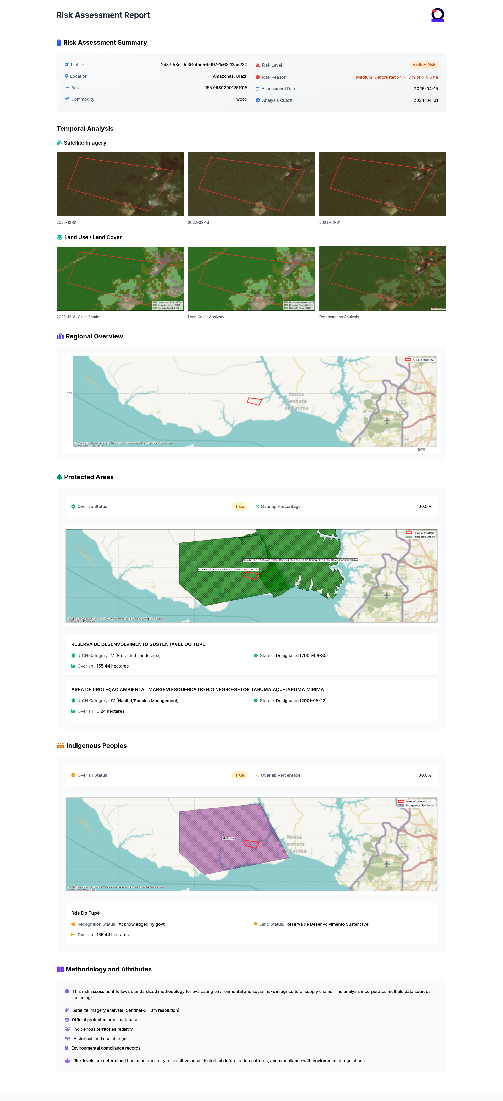 This page describes the updated structure and visual components of the EUDR risk assessment results produced by OpenAtlas Vantage-X. It breaks down each part of the visualisation, explains what it shows, and how it complements the calculated results available through the API. The visualisation is produced for each plot.